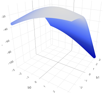 Our simple search indicates that the maximum point of this surface is -8.30, and the set of β0 and β1 coefficients that make the observed data most likely is 1.33 and -1.62.